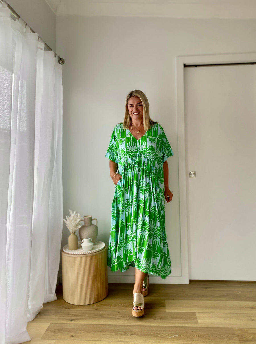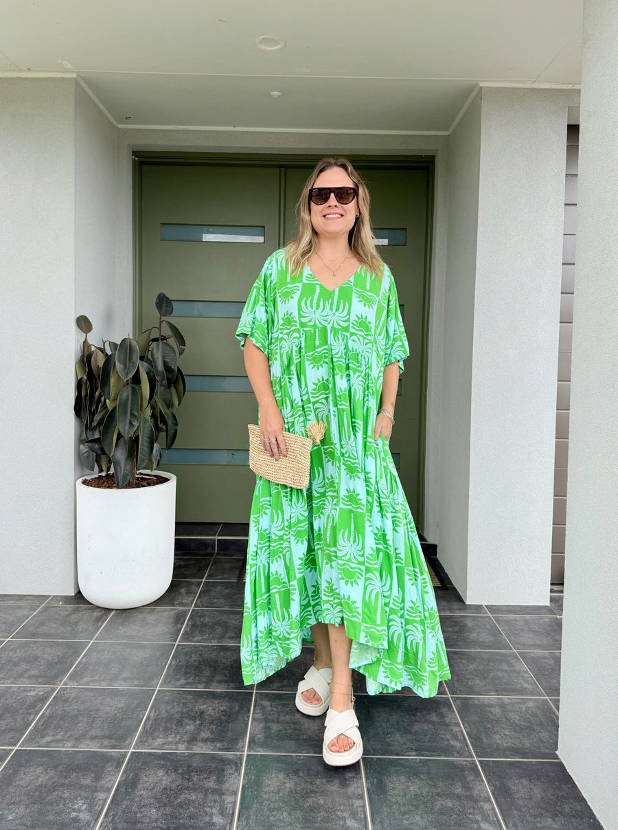 Our WILLOW is our in-house design from dress to the fabric. The dress is short sleeve and falls straight at the back, it’s also has a high low hem line. This dress has pockets.